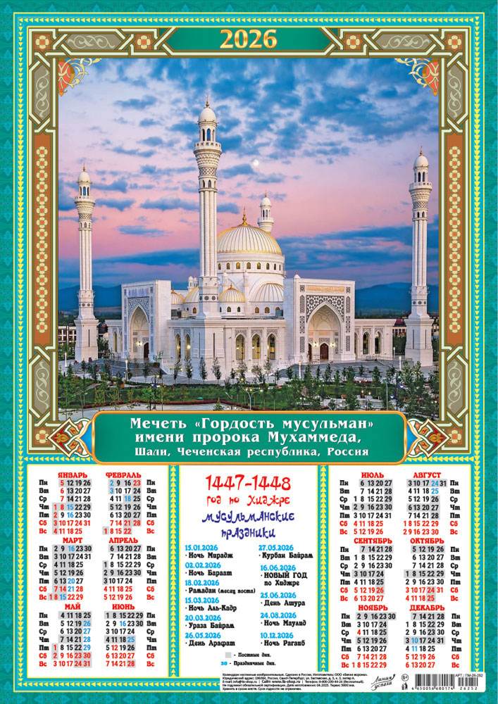 Листовой календарь на 2026 год А3 "Мусульманский календарь. Мечеть "Гордость мусульман", Шали" ПМ-26-252