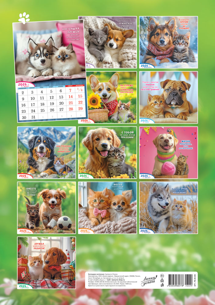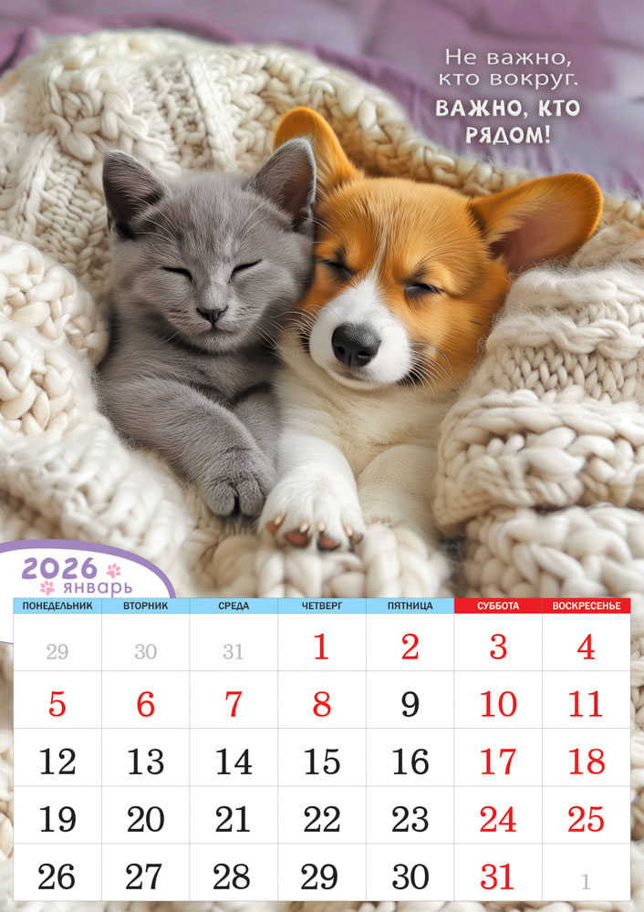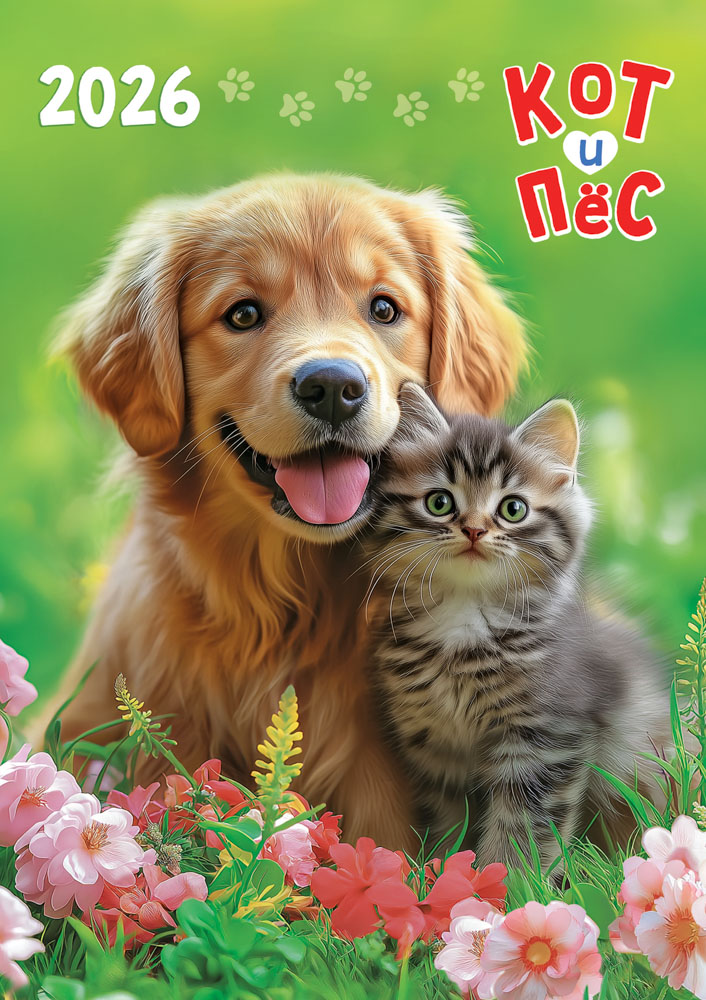 Перекидной настенный календарь на ригеле на 2026 год "Кот и пёс. Верные друзья" РБ-26-029 (в упаковке)