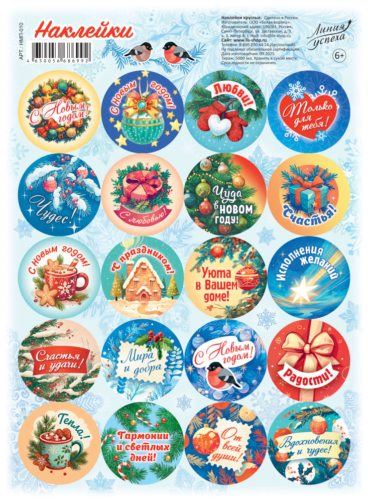 Размер листа 173х236мм. Диаметр каждой наклейки 35мм. УФ-лак.