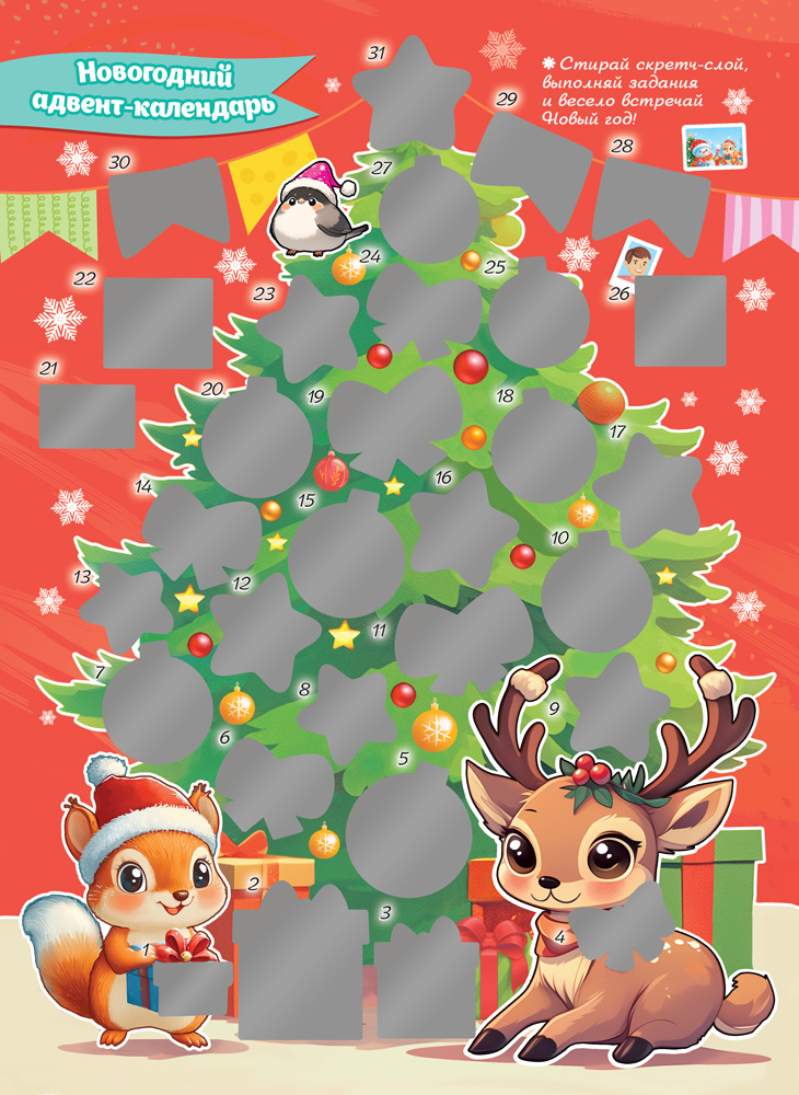 Календарь адвент со скретч-слоем "Новогодняя ёлочка и зверята" АКМ-001