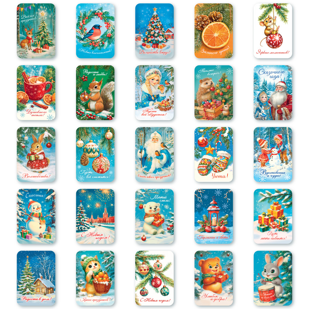 Размер открытки 64х93мм. В наборе 25 штук. Двухсторонняя печать. На обороте без текста. Упакованы в пакет. Цена за набор.