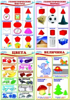 В комплект входят 4 мини-плаката формата А4: 1) Геометрические фигуры; 2) Геометрические формы; 3) Цвета; 4) Величина. Рисунки цветные, на обороте - тексты с заданиями, вопросам, играми, стихами и т.д.