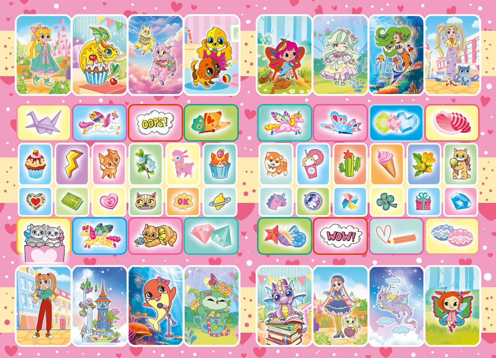 С ИГРОЙ и цветными иллюстрациями, размер в сложенном виде 162х234 мм. Обложка: картон 170 г/м, УФ лак. Внутренний блок: 16 страниц, офсетная бумага 80 г/м. Наклеечный блок: размер 324х234 мм.