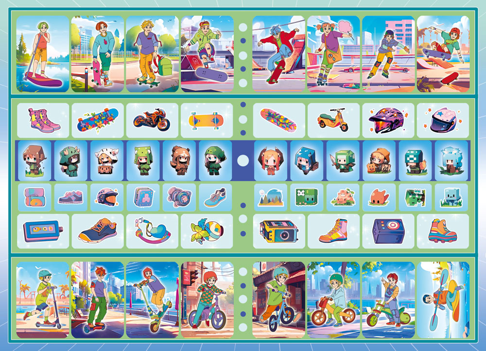 С ИГРОЙ и цветными иллюстрациями, размер в сложенном виде 162х234 мм. Обложка: картон 170 г/м, УФ лак. Внутренний блок: 16 страниц, офсетная бумага 80 г/м. Наклеечный блок: размер 324х234 мм.