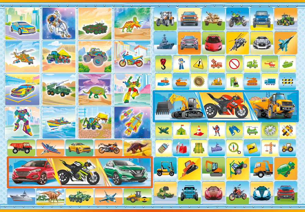 С ИГРОЙ и цветными иллюстрациями, размер в сложенном виде 210х290 мм. Обложка: картон 170 г/м, УФ лак. Внутренний блок: 16 страниц, офсетная бумага 80 г/м. Наклеечный блок: размер 420х290 мм.