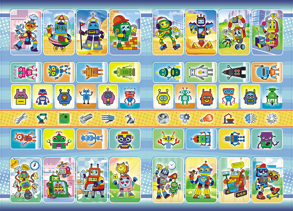 С ИГРОЙ и цветными иллюстрациями, размер в сложенном виде 162х234 мм. Обложка: картон 170 г/м, УФ лак. Внутренний блок: 16 страниц, офсетная бумага 80 г/м. Наклеечный блок: размер 324х234 мм.
