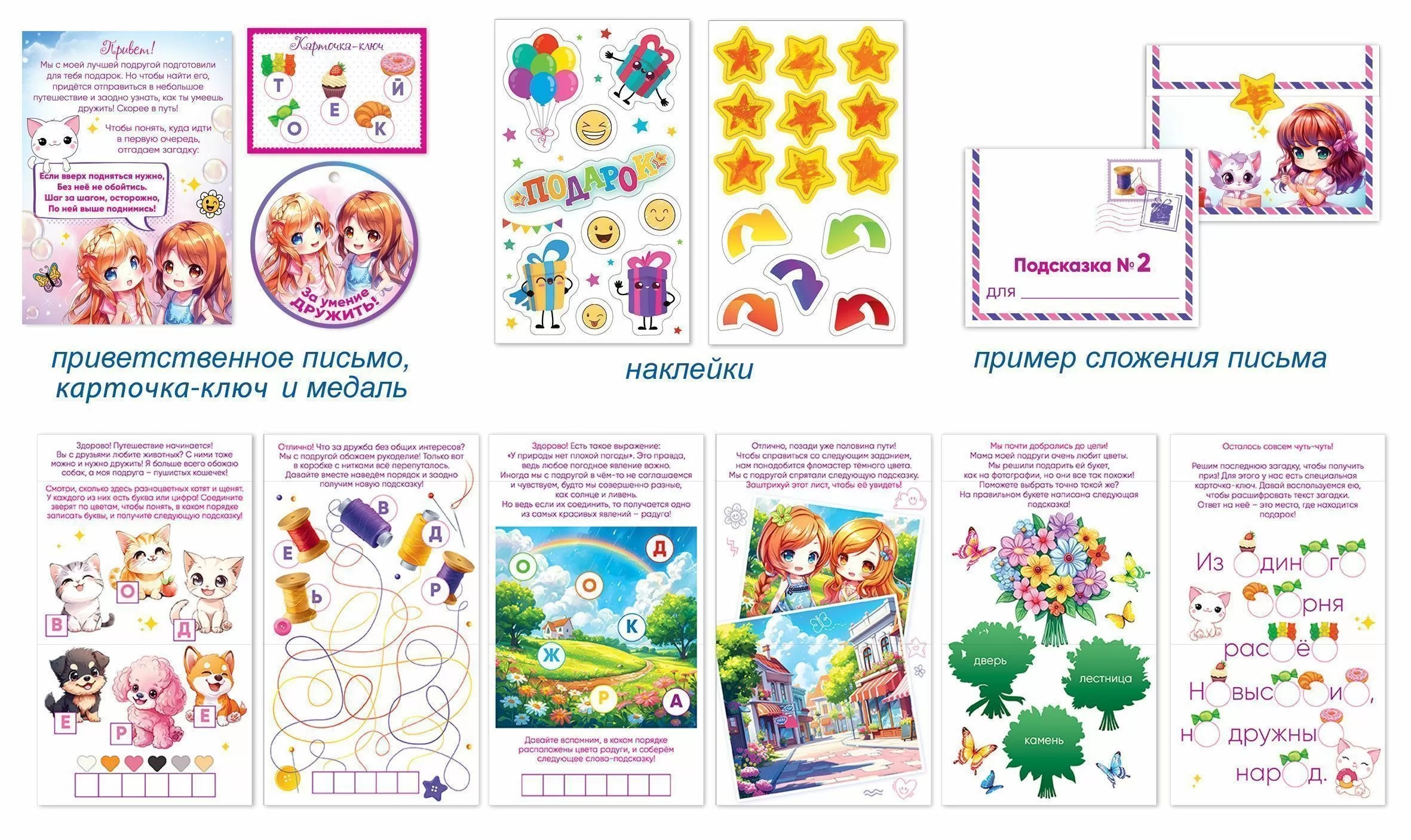 От 5 лет. В наборе: письма с заданиями, наклейки для конвертов и навигации, приветственное письмо, удостоверение, медаль.