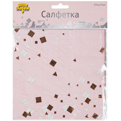 Размер 33х33см. 6 штук. Цена за набор. Двухслойная салфетка розового цвета с фольгированным тиснением (нанесено только на 1/4 часть салфетки, на лицевую сторону).
