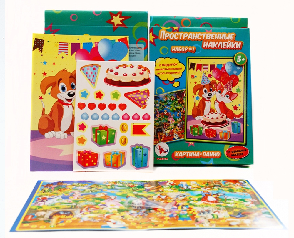 Набор в коробке с европодвесом (22,5х33,5х3см). В набор входит: картина-панно из плотного картона (21х29см), блок из 18 объемных наклеек (17х24см), игровое поле (28х42см), 3 фишки и 1 кубик. Возраст от 3 лет. Красивые "Пространственные наклейки", несомненно, придутся по душе любому ребенку. Благодаря самоклеящейся поверхности, они легко наклеиваютс и отклеиваются, не оставляя следов. Создавая картинку, ребенок развивает фантаззию и творческие навыки, тренирует мелкую моторику и усидчивость!