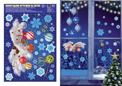 Новогодние наклейки "Новогодние игрушки на еловой ветке" Н-15358
