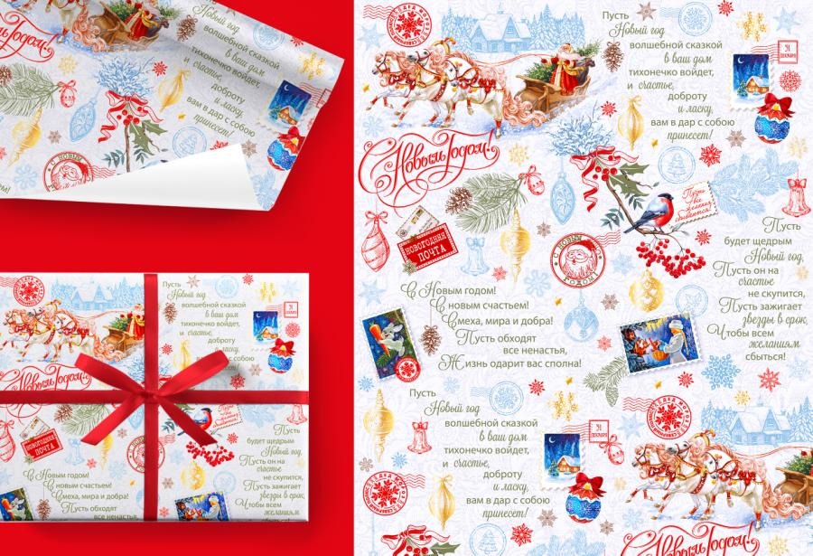 Новогодняя подарочная бумага "Дед Мороз на санях" Ч44675